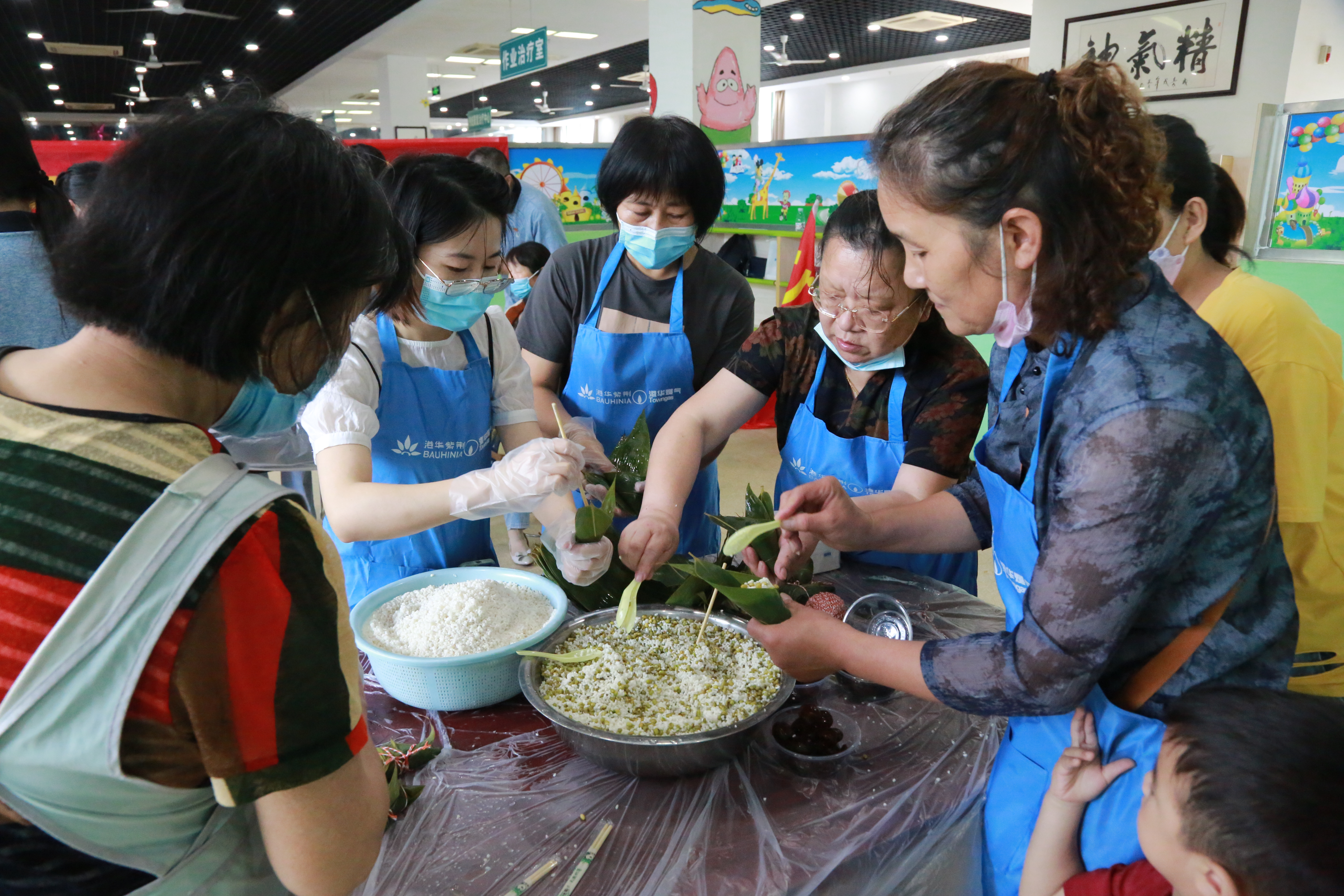 活動中,大家分成三組,圍桌而立,在歡聲笑語中同裹愛心粽。折粽葉、加糯米、添餡料、纏絲線,雖然手藝參差不齊,但每個人都樂在其中,僅僅半小時,各種形狀的粽子就迅速堆滿了幾個籃筐。