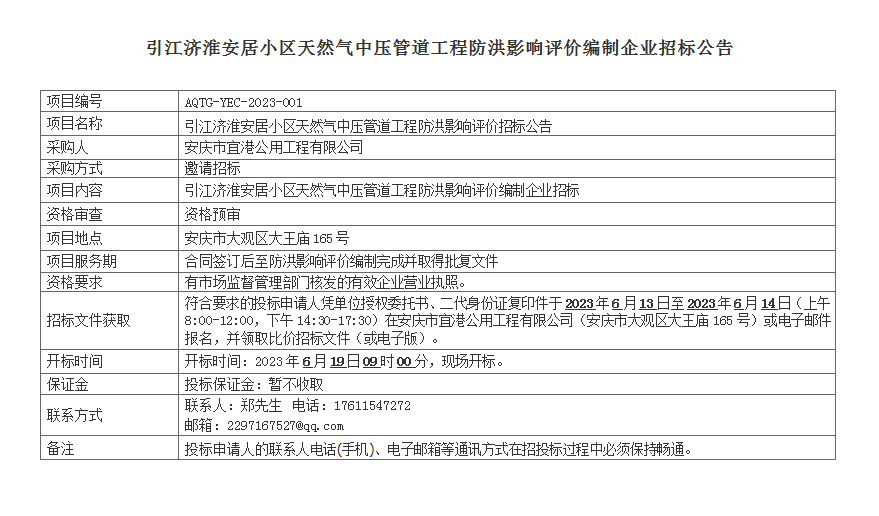 引江濟(jì)淮安居小區(qū)天然氣中壓管道工程防洪影響評價(jià)編制企業(yè)招標(biāo)公告