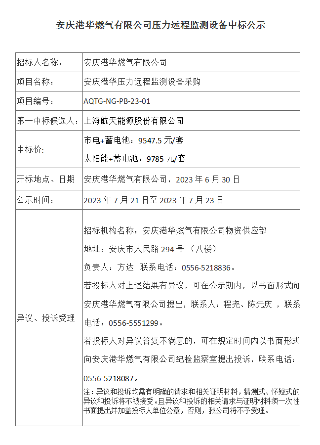 安慶港華燃氣有限公司壓力遠程監(jiān)測設備中標公示