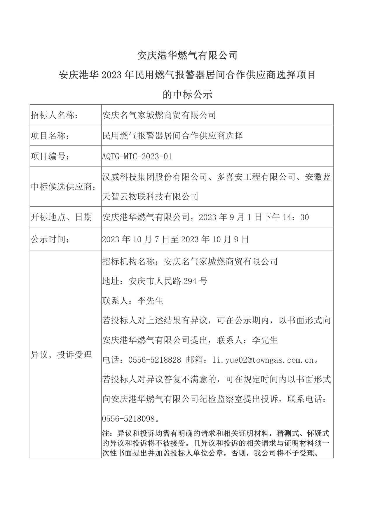 安慶港華燃?xì)庥邢薰?安慶港華2023年民用燃?xì)鈭?bào)警器居間合作供應(yīng)商選擇項(xiàng)目的中標(biāo)公示