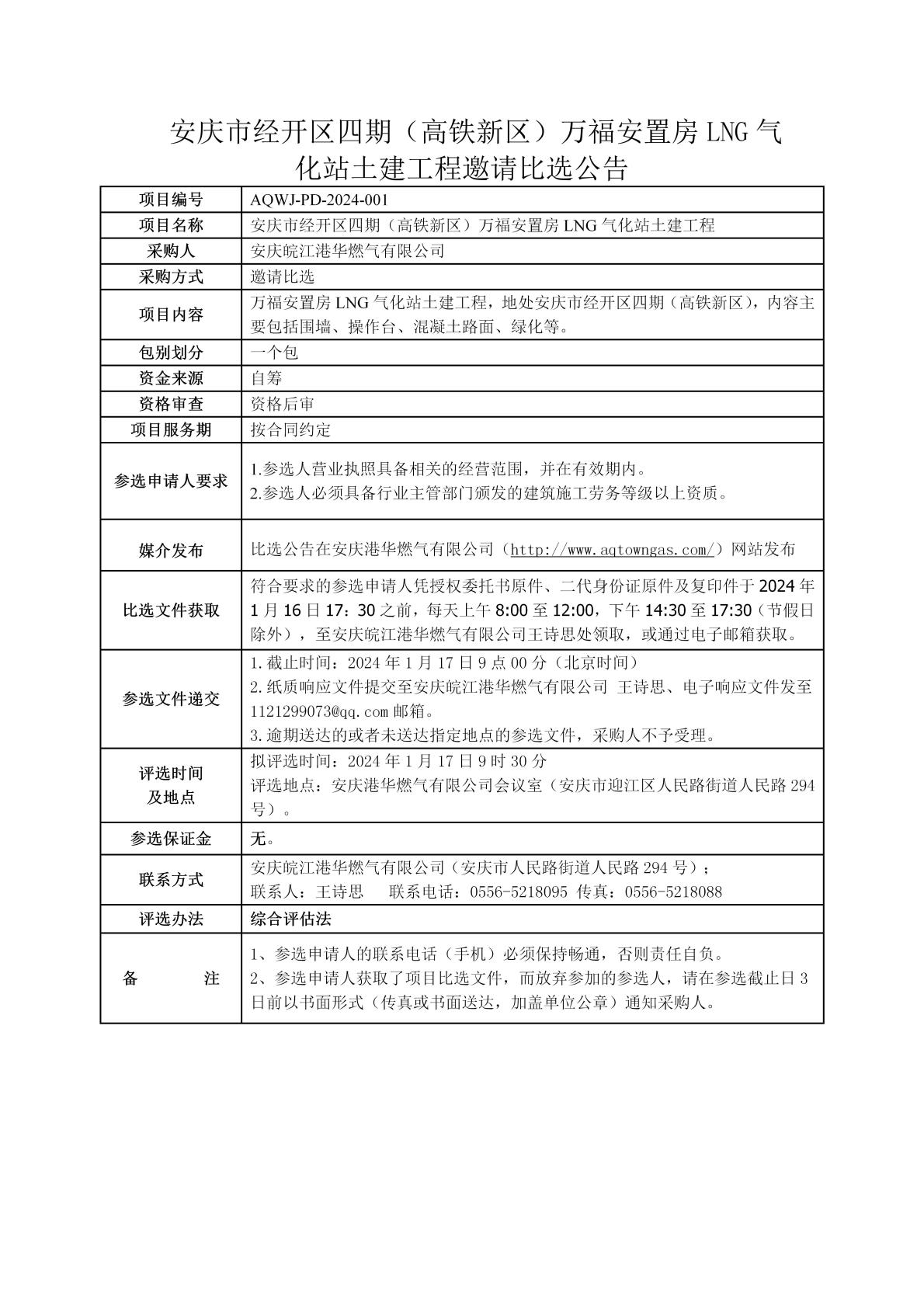 安慶市經(jīng)開區(qū)四期(高鐵新區(qū))萬福安置房LNG氣化站土建工程邀請比選公告