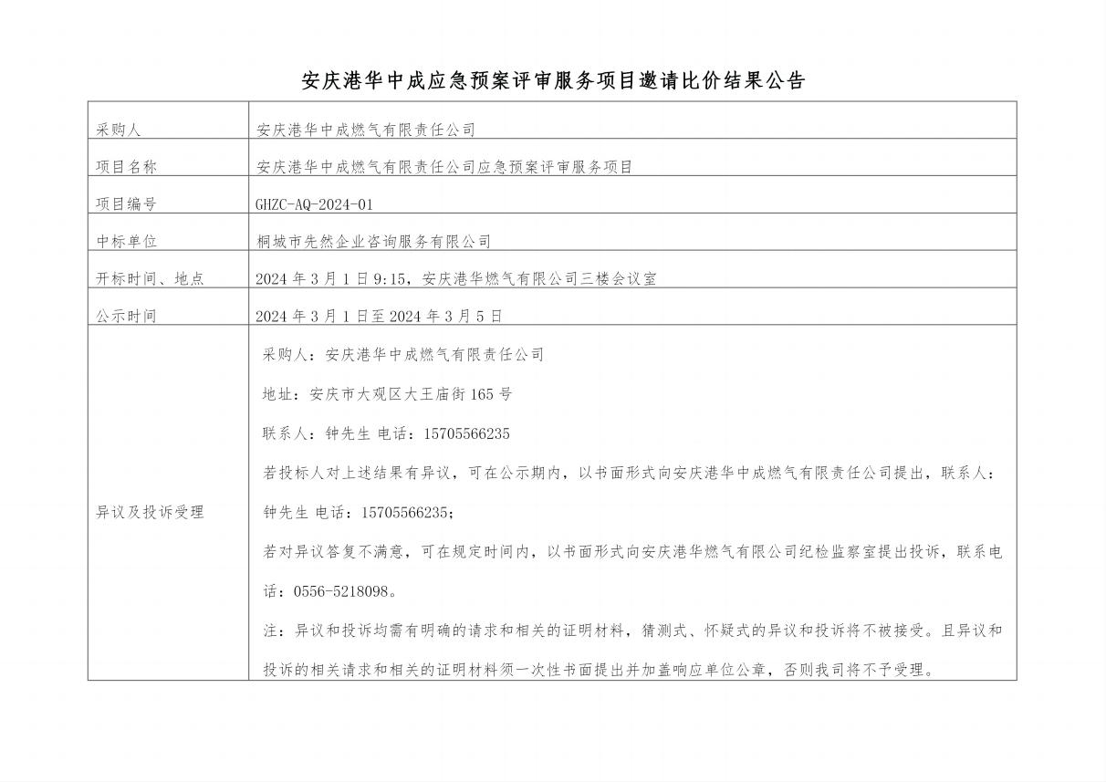 安慶港華中成應急預案評審服務項目邀請比價結果公告