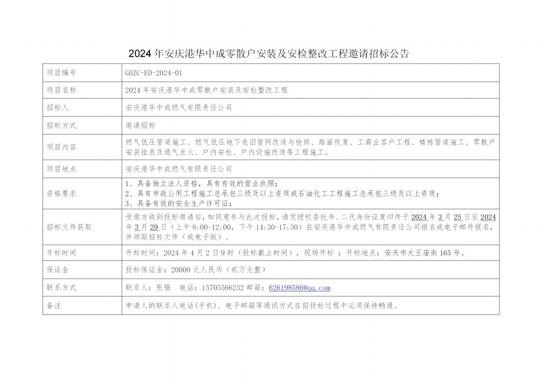 2024年安慶港華中成零散戶安裝及安檢整改工程邀請(qǐng)招標(biāo)公告